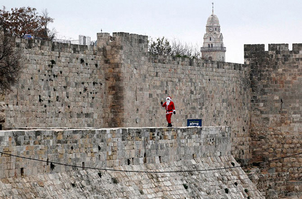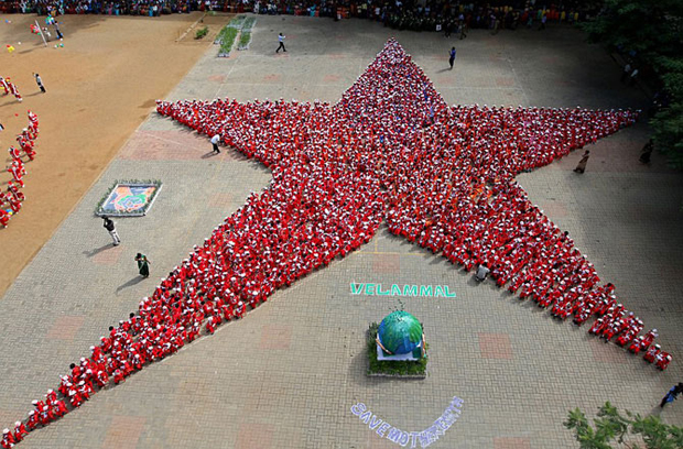 Попытка поставить рекорд Гиннеса в индийском городе Ченнаи: 1 500 школьников возрасте от трех до пяти лет, одетые в костюмы Дедов Морозов, составили вот такую звезду.