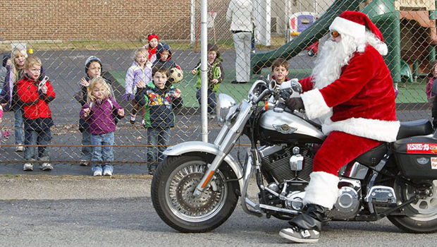 Эти суровые мужики на мотоциклах Harley Davidson тоже любят Рождество и Новый год, американский штат Иллинойс.