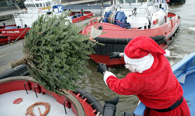 В такие дни руководить погрузкой елки на лодку лучше в костюме Санта Клауса, Гамбург, Германия.