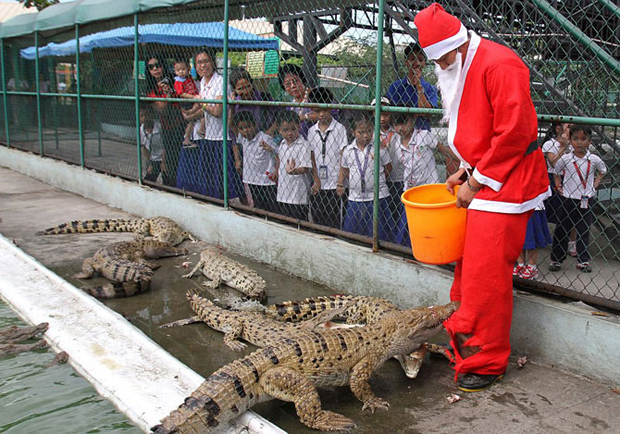 Рождественские подарки современным динозаврам на крокодиловой ферме в Маниле, Филиппины.