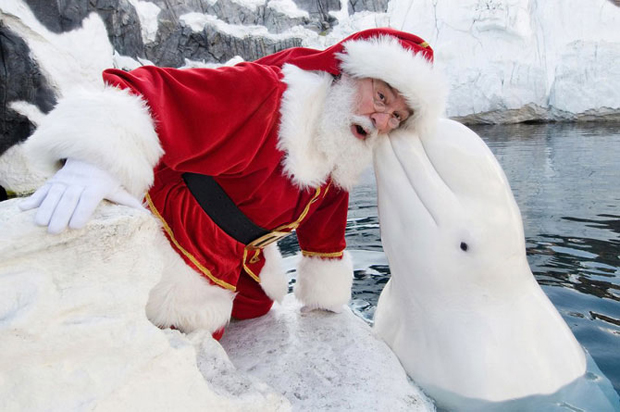 Санта-Клаус и белуха в океанариуме Сан-Диего, Калифорния.