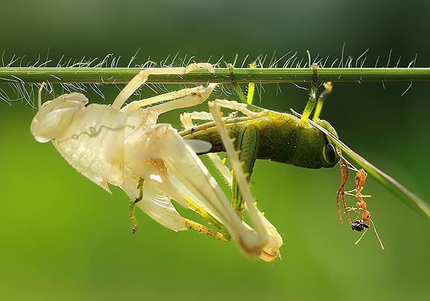 41-летнему Адхи Прайоге из города Матарам, Индонезия, посчастливилось лицезреть в саду своего дома процесс линьки кузнечика. Чтобы избавиться от природного экзоскелета, насекомому понадобилось около 40 минут. По окончанию процесса на травинке остался прозрачный двойник кузнечика.