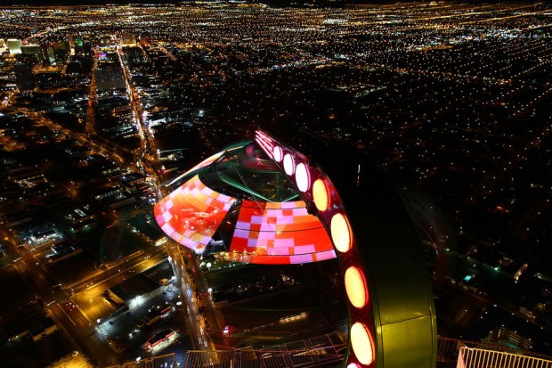 А вот главное ночное мероприятие в Вегасе — визит в самый высокий местный отель — Стратосфера. 350 метров высоты и более 100 этажей. Снизу масштабов бедствия не понять, надо забираться на самый верх: