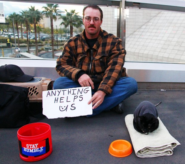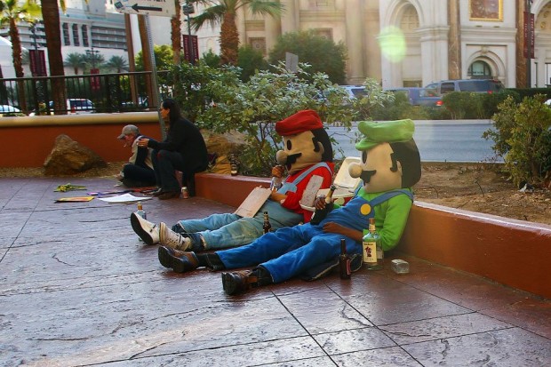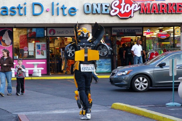 Для тех, кому скучно сидеть и просто просить деньги, в Вегасе есть целая индустрия, построенная на выкачивании денег у родителей через детей. Детвора видит знакомых героев мультиков и фильмов, спешит с ними сфотографироваться (для статуса на Facebook, ясное дело!) … а родители вынуждены платить за это денежку. Вот Бамбл-Би из «Трансформеров» спешит с работы домой. Надеюсь, он свое уже заработал: