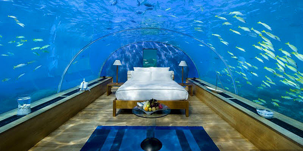 Во время размещения в подводных апартаментах гостям номера предлогали ужин с шампанским и завтрак в постель.