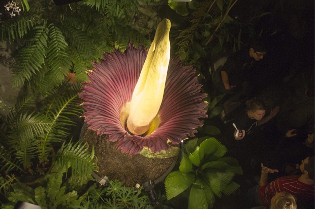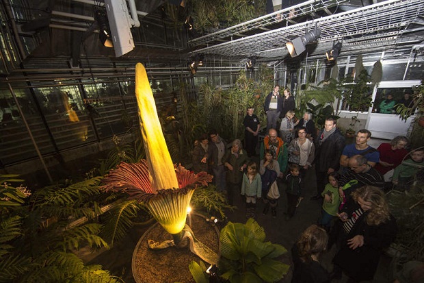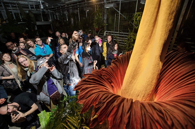 В швейцарском ботаническом саду в Базеле распустился самый большой в мире цветок — Титан Арум (Аморфофаллус титанический) высотой 2,27 метра. Лепестки цветка — темно-красные, а початок — желтый. Несмотря на то, что от растения исходит запах тухлого мяса, посмотреть на цветение собралось множество посетителейю.