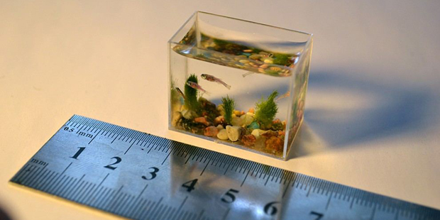 Этот малюсенький аквариум сделан из стеклопластика, на дне растут живые водоросли, и рыбки в нем тоже самые настоящие – 5 мальков данио рерио, размер которых не превышает 4 миллиметра.Размер наноаквариума, сделанного Анатолием и Станиславом Коненко 12 февраля 2011 года составляет 30 х 24 х 14 мм. Объем микрорезервуара – 10 мл., что составляет 2 чайные ложки. Это абсолютный рекорд, ведь до этого размер самого маленького аквариума составлял 60 миллилитров.