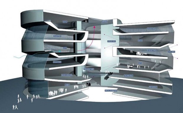 4. Из-за открытой конструкции музея различные выставочные залы соединены друг с другом без каких-либо пожарных зон через внутренний двор и наклонные площадки.