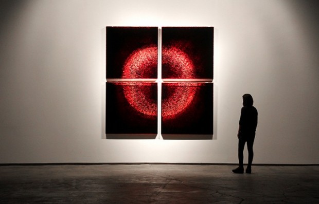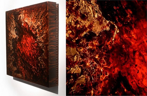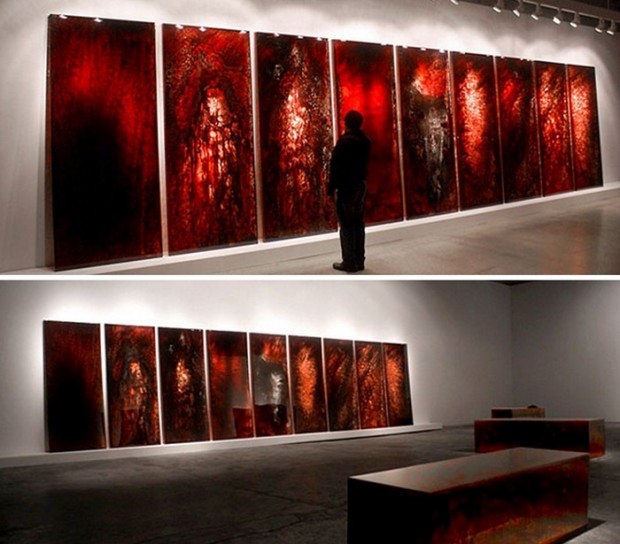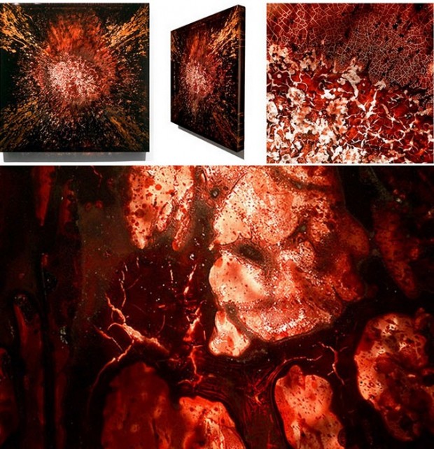 Проделывая с ней разнообразные манипуляции, — запекая, выпаривая, состаривая, смешивая с медью и другими веществами, художник и превращает кровь в творческий материал для создания своих абстрактных полотен.