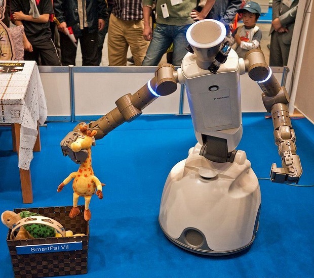 А это изобретение фирмы Yaskawa предназначено для пожилых людей или инвалидов. Робот управляется дистанционно и способен поднимать и переносить небольшие предметы, а также транслировать видео.