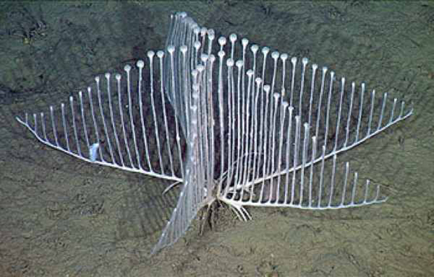 Большинство кораллов получает питательные вещества от фотосинтезирующих водорослей, которые живут в их тканях. Это также означает, что они должны жить в пределах 60 метров от поверхности. Но только не этот вид, также известный под именем Губка-Арфа. Он был обнаружен в 2000 метрах от побережья Калифорнии, но только в этом году учёные подтвердили, что он плотояден. Похожий по форме на канделябр он растягивается по дну, чтобы увеличиться в размере. Он ловит мелких ракообразных крошечными крючками, похожими на липучку и затем натягивает на них мембрану, медленно переваривая их с помощью химикатов. В добавку ко всем своим странностям, он ещё и размножается по-особенному – «пакетиками спермы» — видите эти шарики на конце каждого отростка? Да, это пакеты сперматофоров, и время от времени они уплывают, чтобы найти другую губку и размножиться.