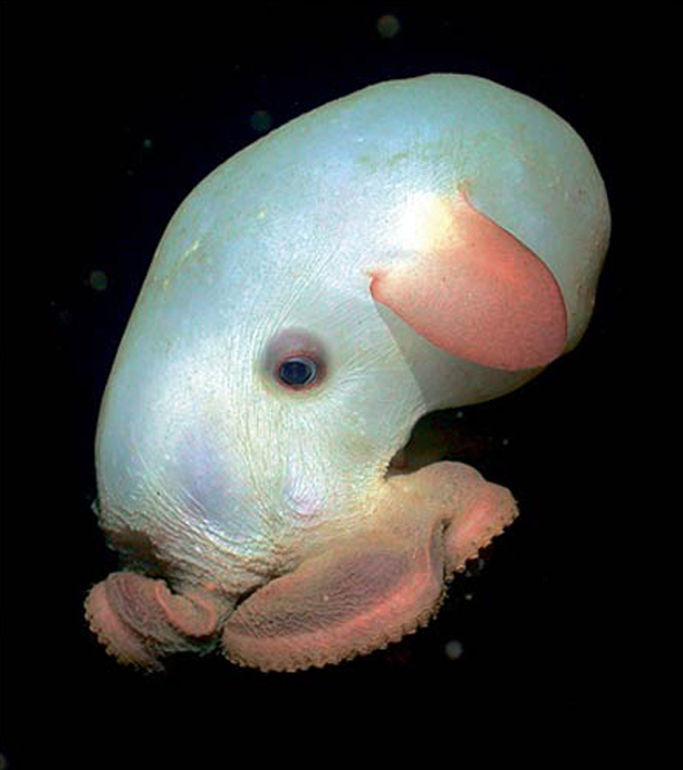 Эта ярко окрашенная особь (зачем нужен яркий окрас, когда цвета бесполезны, если вы живете там, куда свет не может проникнуть) является членом неудачно названного вида «мягкотелой китоподобной рыбы». Этот экземпляр выловили у восточного побережья Новой Зеландии, на глубине более 2 километров. В нижней части океана, в придонных водах, они не ожидали найти много рыбы — и в самом деле оказалось, что у мягкотелой китоподобной рыбы нет множества соседей. Это семейство рыб обитает на глубине 3 500 метров, у них маленькие глаза, которые вообще-то абсолютно бесполезны, учитывая их среду обитания, но зато у них феноменально развита боковая линия, помогающая им почувствовать вибрацию воды.