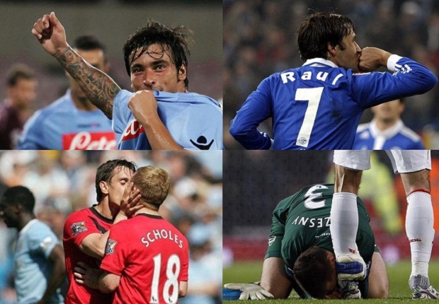 В идеале, конечно, герб своего клуба или страны на майке. Впрочем, можно поцеловать обручальное кольцо, товарища по команде… или часть его тела, которой был забит решающий гол в матче.