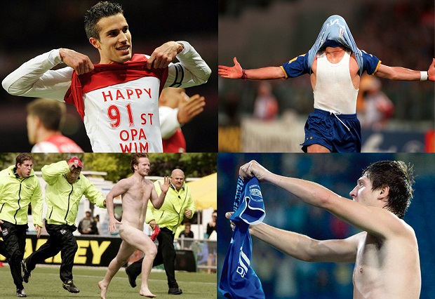 Самый нелюбимый способ арбитров, за который штрафуют нещадно. Некоторые ограничиваются приподнятой майкой, другие же (в большинстве своем — экзальтированные фанаты) устраивают голый забег.