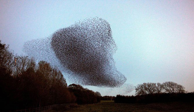 Во время зимовки каждый день на закате множество скворцов «пускаются в пляс» в небе, выделывая коллективные пируэты.