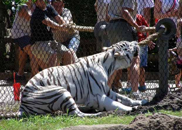 Выяснить, кто круче, можно в американском зоопарке Busch Gardens Zoo в Тампа-бэй, во Флориде путём перетягивания каната с 200-кг бенгальским тигром. Такой аттракцион называется Tiger Tug (Тигриный канат) и представляет собой пеньковую верёвку, протянутую через две металлические сетки, разделяющие полосатого кошачьего и добровольца, рискнувшего померяться силами с громадной киской.