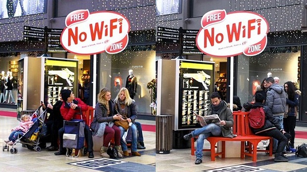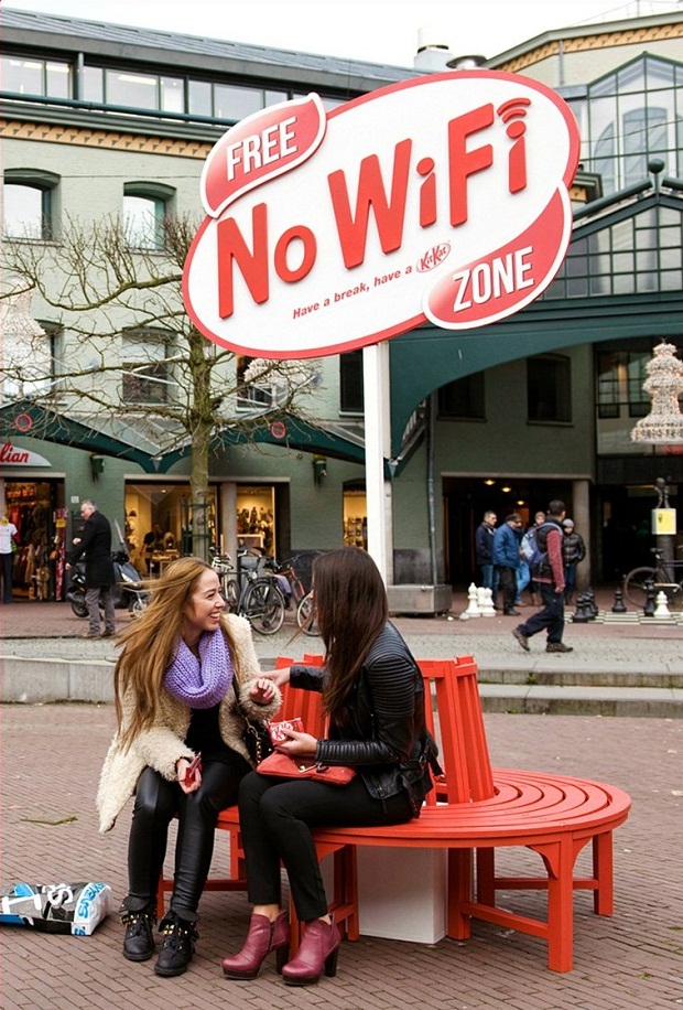Гигантский знак сообщает прохожим о том, что в радиусе 5 метров «Free No-WiFi Zone» вы отдохнете от лайков, статусов и сообщений. Агентство JWT Амстердам придумало такую оригинальную инсталляцию для бренда Kit-Kat.