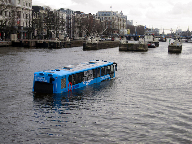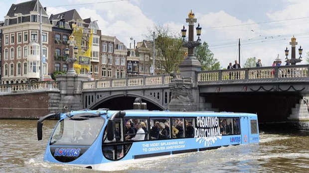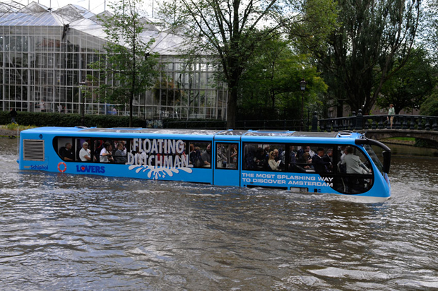 Гости Амстердама видят теперь необычную картину: автобус, который погружается в реку Амстел и плавает по каналам. Это новая возможность осматривать достопримечательности города с так называемым Floating Dutchman. Автобус на 50 пассажирских мест может и ехать по суше и плыть по воде.