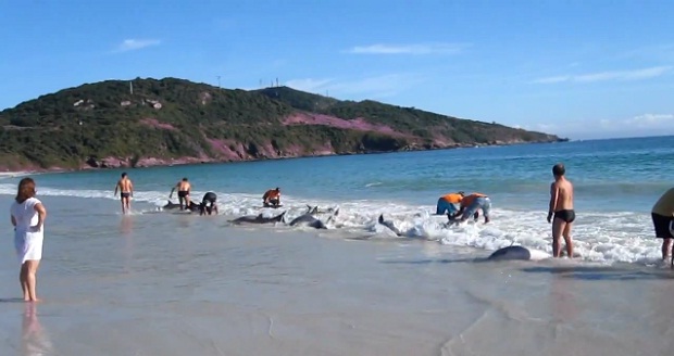 В Бразилии группа туристов, отдыхавших на пляже у небольшого курортного городка рраял-ду-Кабу в 170 км от Рио-де-Жанейро, спасли жизнь 30 дельфинам, которых вынесло сильным течением на берег.