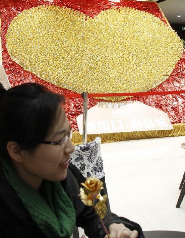 В одном из ювелирных магазинов в китайском городе Нанкин на продажу выставили 1999 роз, изготовленных из золота. Стоимость одного цветка, каждый из которых сделан из тонкой металлической фольги, составляет 299 юаней (примерно 45 долларов США). Как много драгоценных цветов удалось продать в первый день, не уточняется.