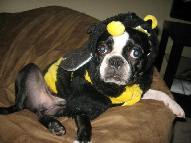 Пес любит играть с теннисным мячиком, спать на хозяйской кровати, а особенно ему нравится примерять смешные костюмы — по крайней мере, так считает его хозяйка.