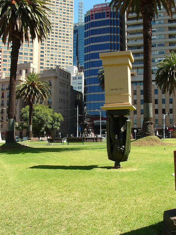 «Так и приметней и запоминается лучше» — подумал австралийский скульптор из Мельбурна Чарльз Робб (Charles Robb) и создал перевёрнутый памятник весьма значимой австралийской фигуре времён колонизации — первому вице-губернатору колонии Виктория (ныне штат) Чарльзу Ла Тробу. Ла Троб занимал пост с 1839 по 1854 года и оказал помощь в создании Королевских Ботанических Садов, библиотеки, музея Виктории, Национальной Галереи Виктории и Университета Мельбурна.