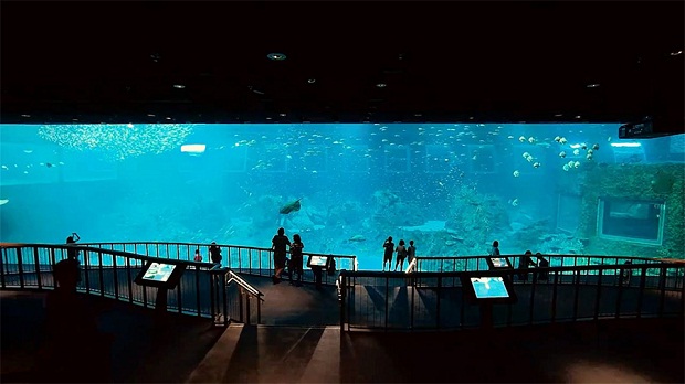 Самая большая гордость аквариума – огромная стеклянная стена шириной 35,4 метра и высотой более 8 метров, через которую можно наблюдать за его обитателями.