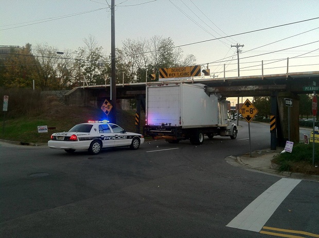 Мост низкий, поэтому дорожные службы поставили перед ним кучу знаков, сообщающих о том, что желающих проехать под мостом на слишком высоком авто ждет фиаско, авария и штрафы за разбитый грузовик и побитый мост.