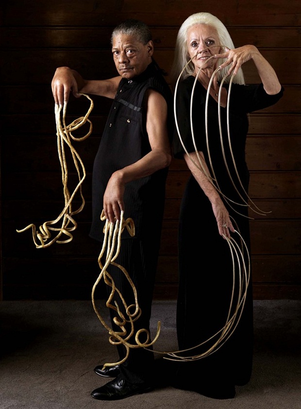 3. Ли Редмонд (справа), бывшая рекордсменка с титулом Самые длинные ногти, и Мелвин Бут – нынешний владелец титула. Его ногти равны 9 м. Ли Редмонд потеряла свои ногти в автомобильной аварии в 2010 году. (Photo by Ronald Mackechnie/Guiness World Records Book Launch/Associated Press)
