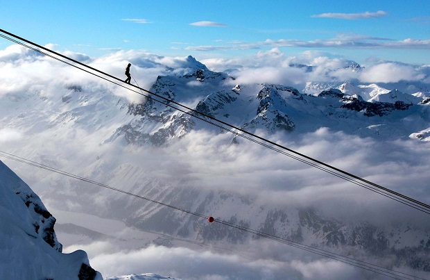 9. Фредди Нок идет по канату фуникулерной дороги от верхней станции в 3 303 м над уровнем моря к нижней станции в Сильваплана, Швейцария. (Photo by Arno Balzarini/Keystone/Associated Press)