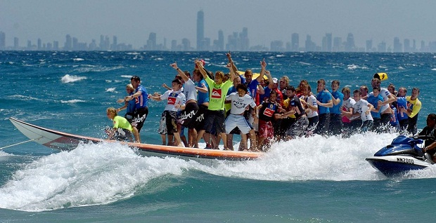 17. Серфингисты на самой длинной доске для серфинга в мире – 47 сеферов поместились на 12-метровую доску на Золотом побережье Австралии. (Photo by Steve Holland/Associated Press)