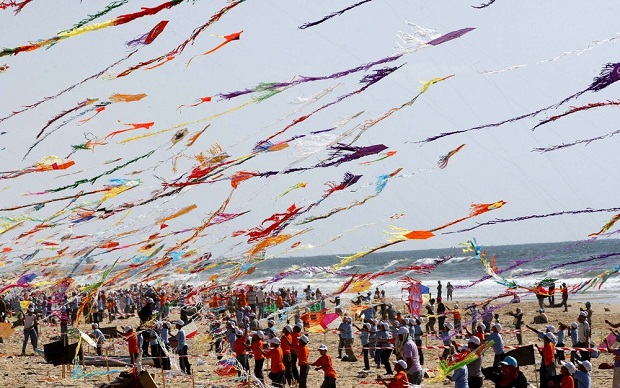 18. Тысячи детей запускают воздушных змеев, пытаясь побить мировой рекорд на самое большое количество змеев, запущенных одновременно, в северной Газе. Более 7200 воздушных змеев поднялись в воздух. (Photo by Khalil Hamra/Associated Press)