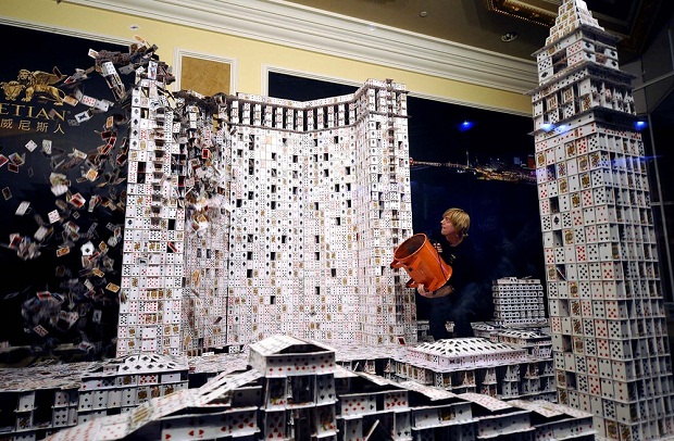 24. Американский мастер по строительству карточных домиков Брайан Берг ломает свое творение – карточную версию казино и отеля в Макао. На создание ушло 44 дня и 218 792 карты. (Photo by Dale de la Rey/AFP Photo)