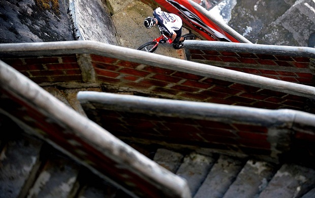 26. Велосипедист Ксавье Запата едет по лестнице монолита Пьедра дель Пенол в Гуатапе, Колумбия. Он проехал 649 ступенек за 43 минуты. Рекорд установлен. (Photo by Raul Arboleda/AFP Photo)
