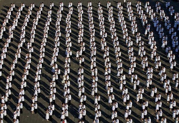 4. Филиппинские студенты, преподаватели и работники Университета Санто-Томас сделали Доминиканский крест, который вошел в Книгу рекордов Гиннеса. Крест состоял из более чем 20 000 человек. (Photo by Aaron Favila/Associated Press)