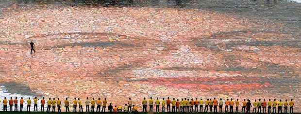 41. Студенты колледжа стоят у самой большой фото-мозаики бывшего президента Филиппин Корасон Акино в Маниле. Мозаика состоит из 3200 фотографий и весит почти 4 тонны. (Photo by Noel Celis/AFP Photo)