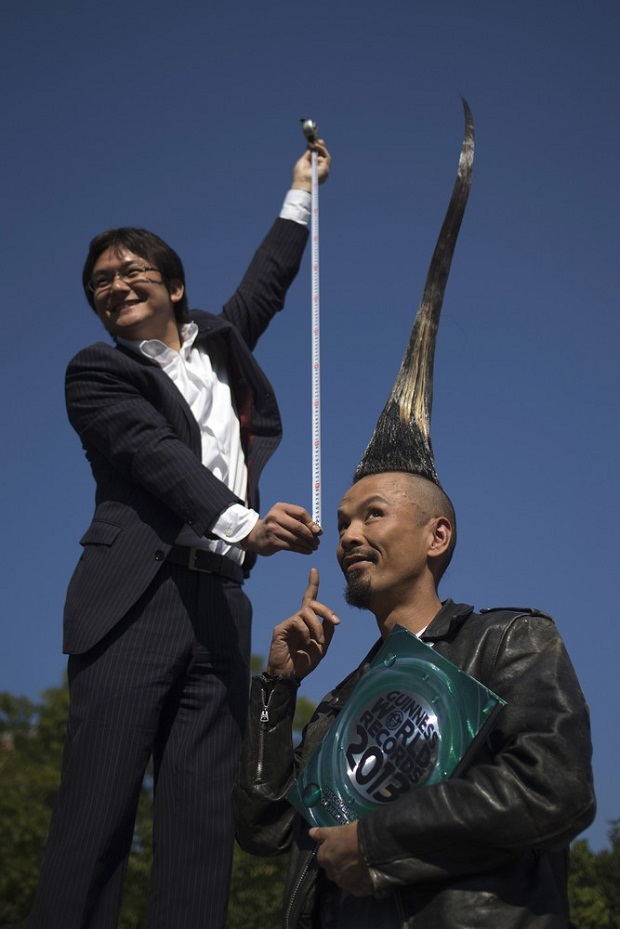 42. Тележурналист Такаши Янагисава измеряет самый большой ирокез в мире. Его владелец – японский дизайнер Кацухиро Ватанабе. Высота ирокеза – 1,1 метр. (Photo by Adrees Latif/Reuters)