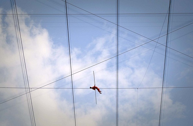 44. Адили Вуксор лежит на канате в последний день своей двухмесячной прогулки по канату над стадионом в Пекине. Адили ходил по канату по пять часов в день. (Photo by Alexander F. Yuan/Associated Press)