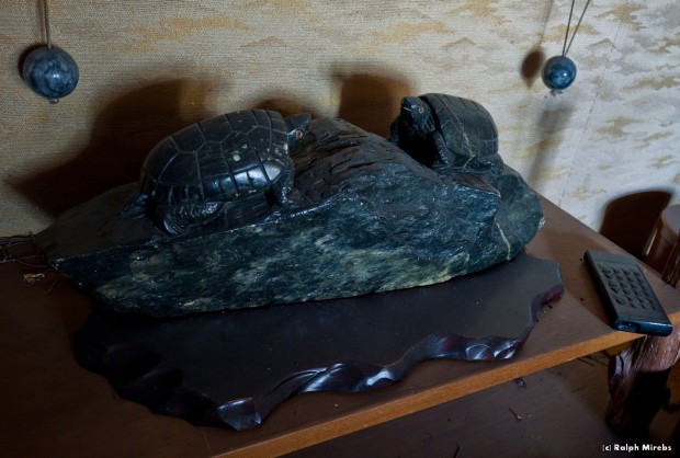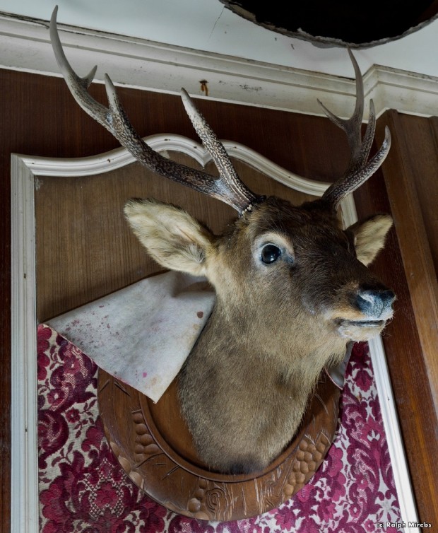 А вот этот номер представляет собой комнату охотника. Крыша, к сожалению, за 15 лет прохудилась, диван изрядно подмочило водой, а трухлявый пол того и гляди провалится.