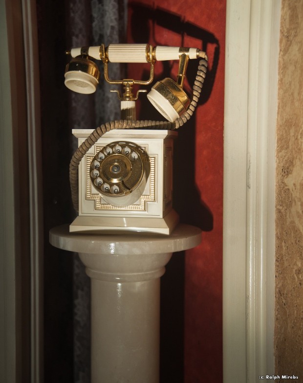 Номер номер один декорирован в стиле европейского дворца — статуи, колонны, антикварный телефон, большая люстра.