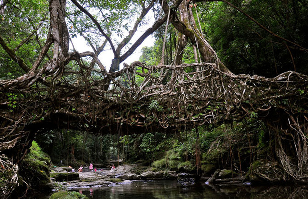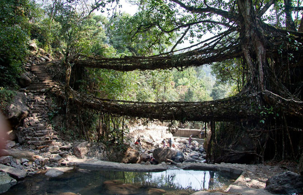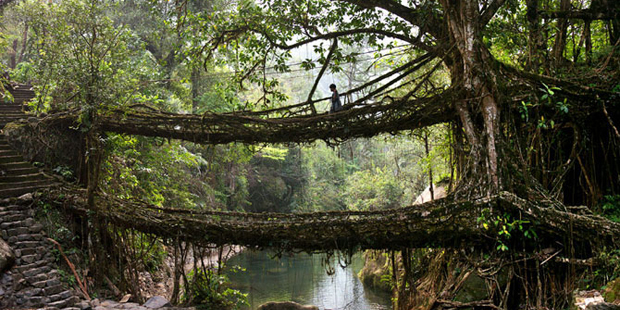 Мы отправляемся в район городка Черапунджи на северо-востоке Индии, который находится на высоте 1 300 метров и считается самым дождливым местом на Земле. Здесь для «выращивания» мостов используют корни каучуконочного фикуса. Процесс «строительства» длится 10-15 лет. Живые мосты могут достигать длины 30 метров и выдерживать вес более 50-ти человек.